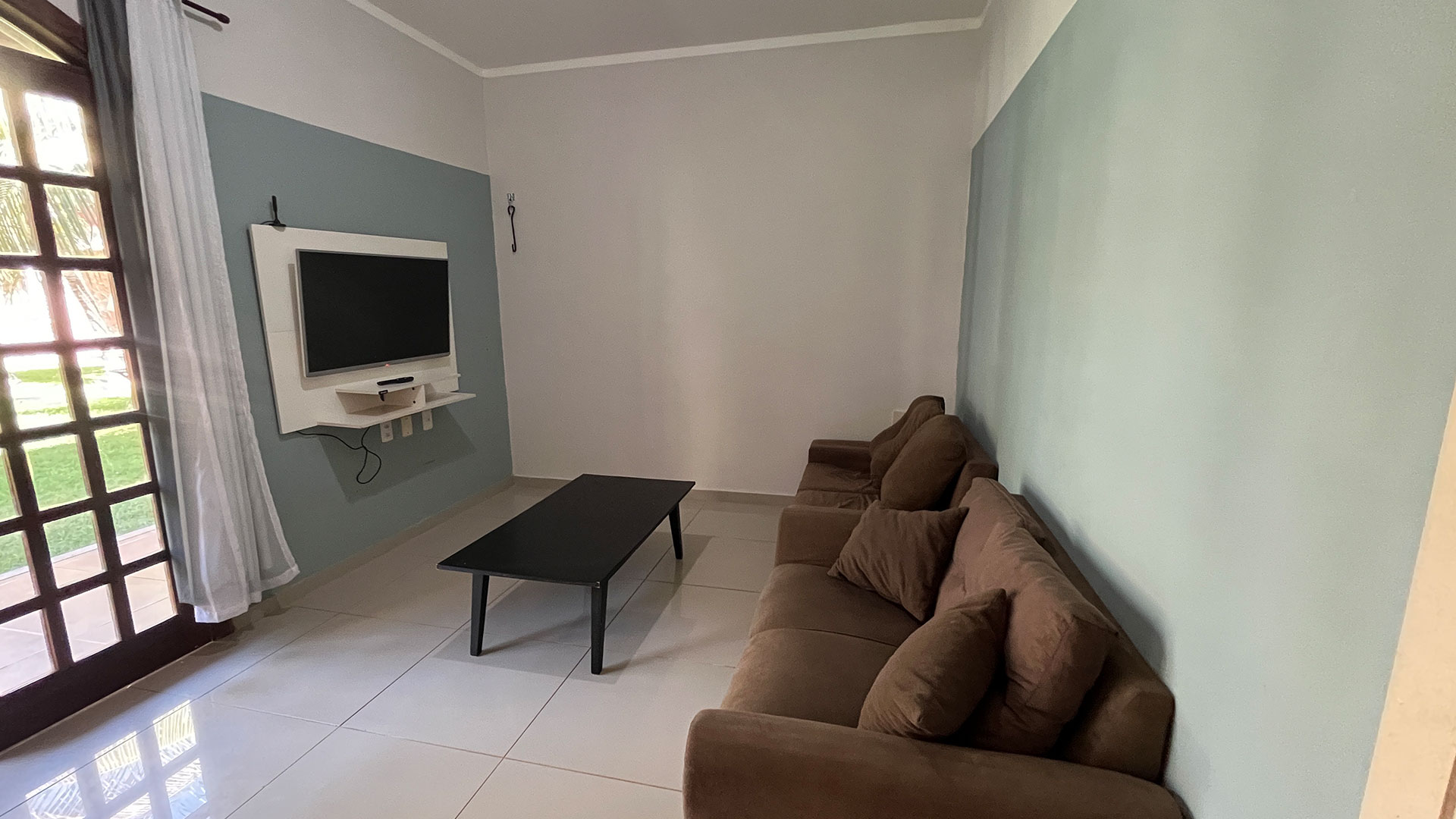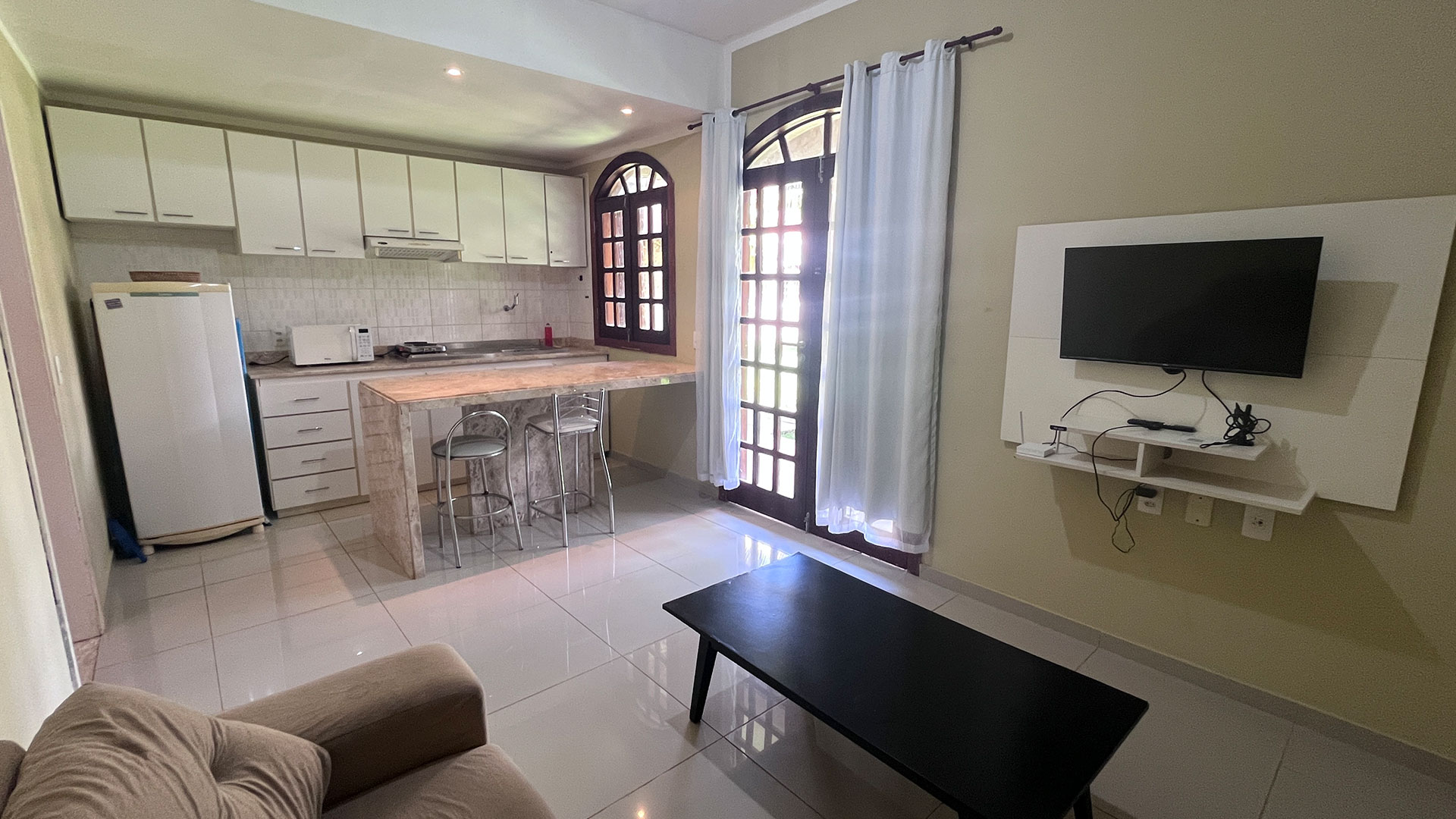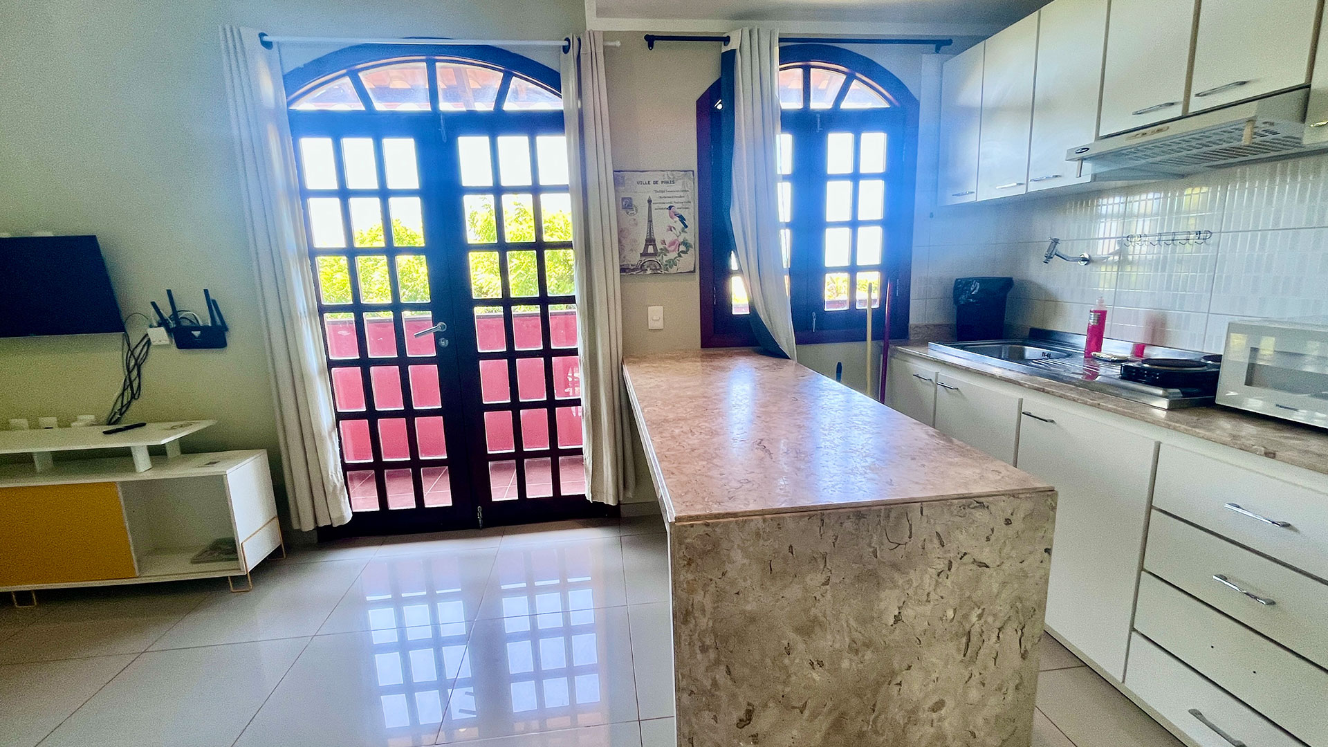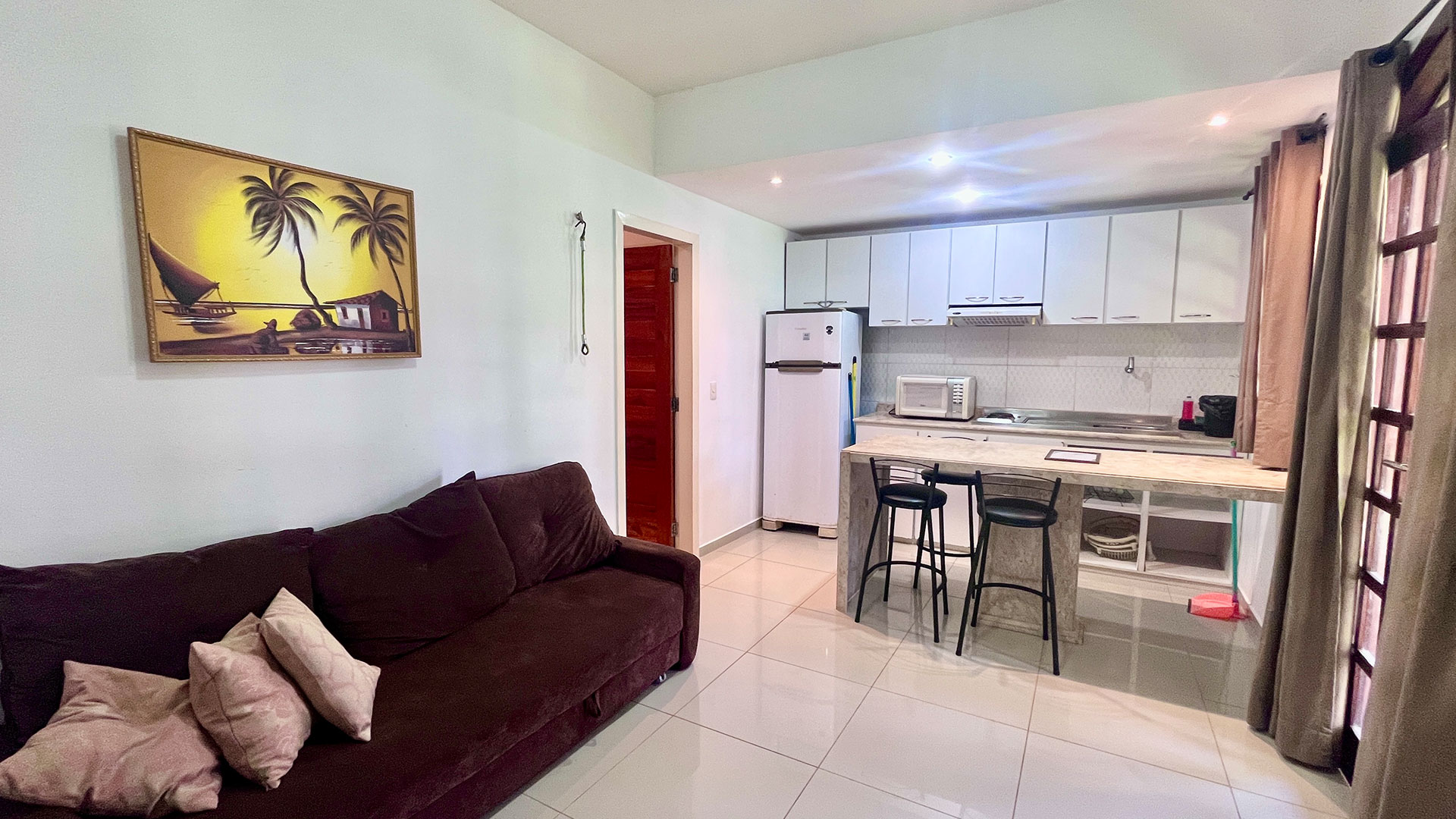 O espaço é funcional e bem equipado, com sala de estar, Wi-Fi, TV e uma cozinha completa que garante mais liberdade durante a estadia. A suíte climatizada acomoda bem, com cama de casal e camas de solteiro, além de varanda com vista direta para a piscina, que faz toda diferença no dia a dia. No geral, é uma opção prática e confortável, perfeita pra casais, famílias ou pequenos grupos.