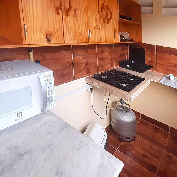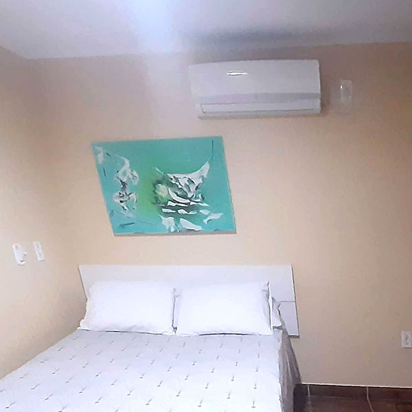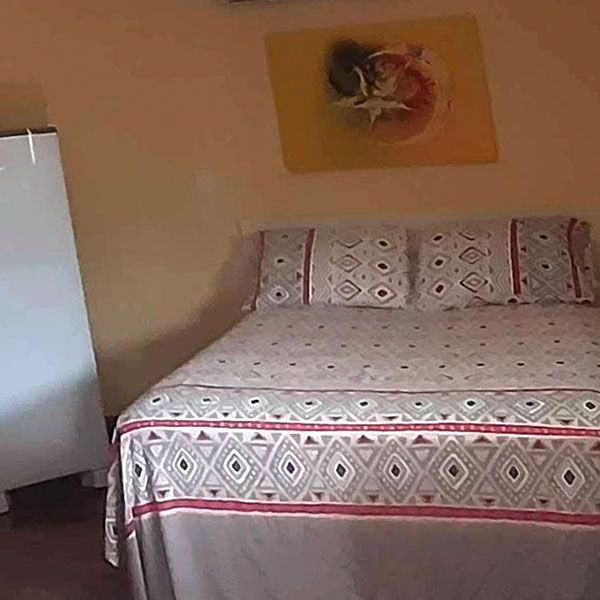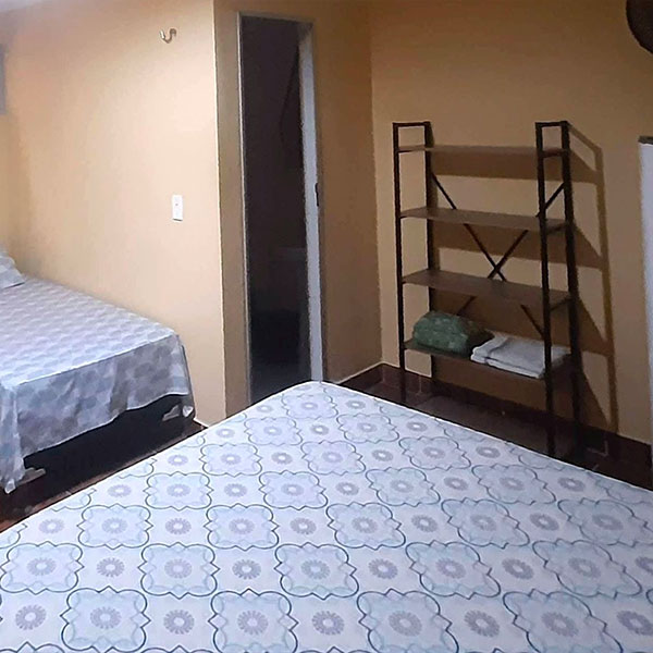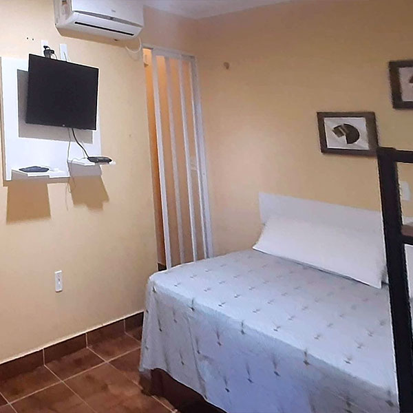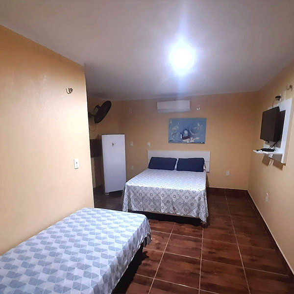 Os quartos são aconchegantes e bem equipados, com ar-condicionado, TV e geladeira, garantindo uma estadia confortável no dia a dia. Além disso, a casa conta com uma cozinha de apoio com fogão, micro-ondas e utensílios básicos, perfeita pra quem quer mais liberdade durante a viagem.