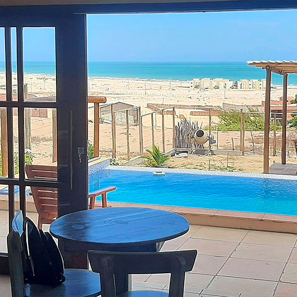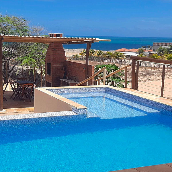 São 3 suítes climatizadas, todas equipadas com ar-condicionado e frigobar, além de uma sala confortável conectada à cozinha americana completa. Do lado de fora, a piscina com vista para o mar e o deck com churrasqueira são os grandes destaques, perfeitos pra relaxar ou reunir todo mundo, com espaço de sobra e estacionamento para até 4 carros.